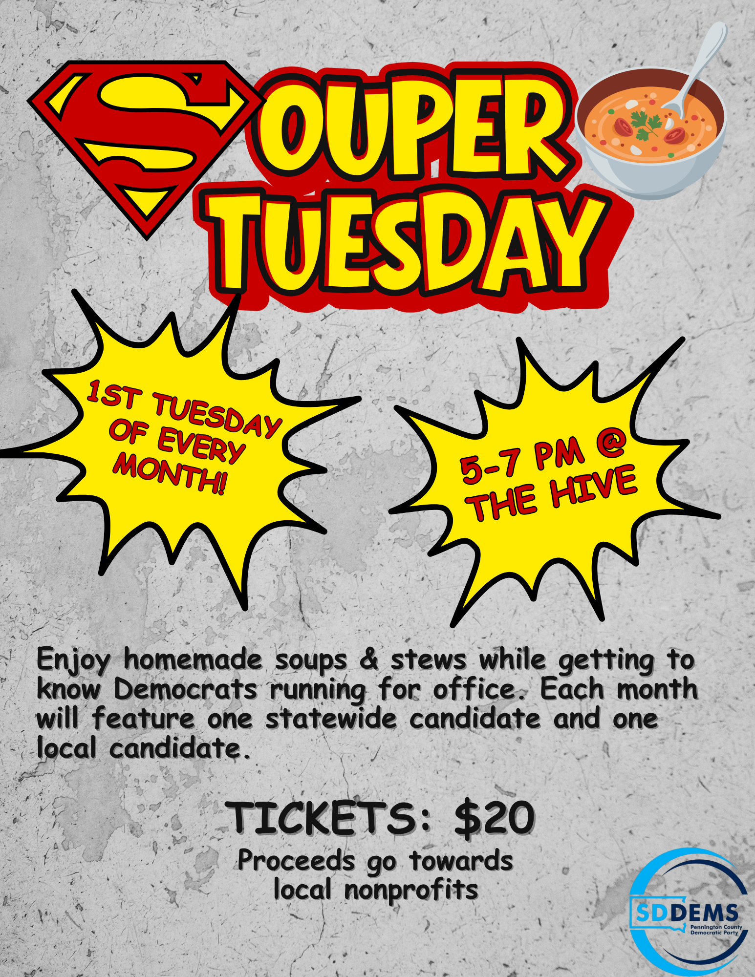 Join us on the first Tuesday of each month, from 5–7 PM at The Hive, to get to know your candidates one-on-one while enjoying delicious homemade soups and stews.