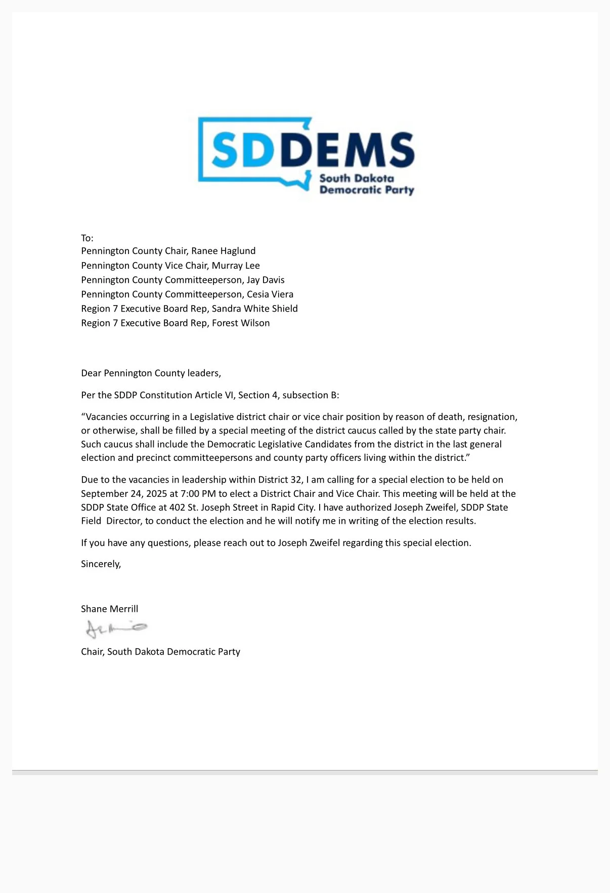 In a letter addressed to Pennington County party leaders, State Party Chair Shane Merrill cited Article VI, Section 4, subsection B of the SDDP Constitution, which requires that vacancies in legislative district chair or vice chair positions be filled through a caucus called by the state party chair.